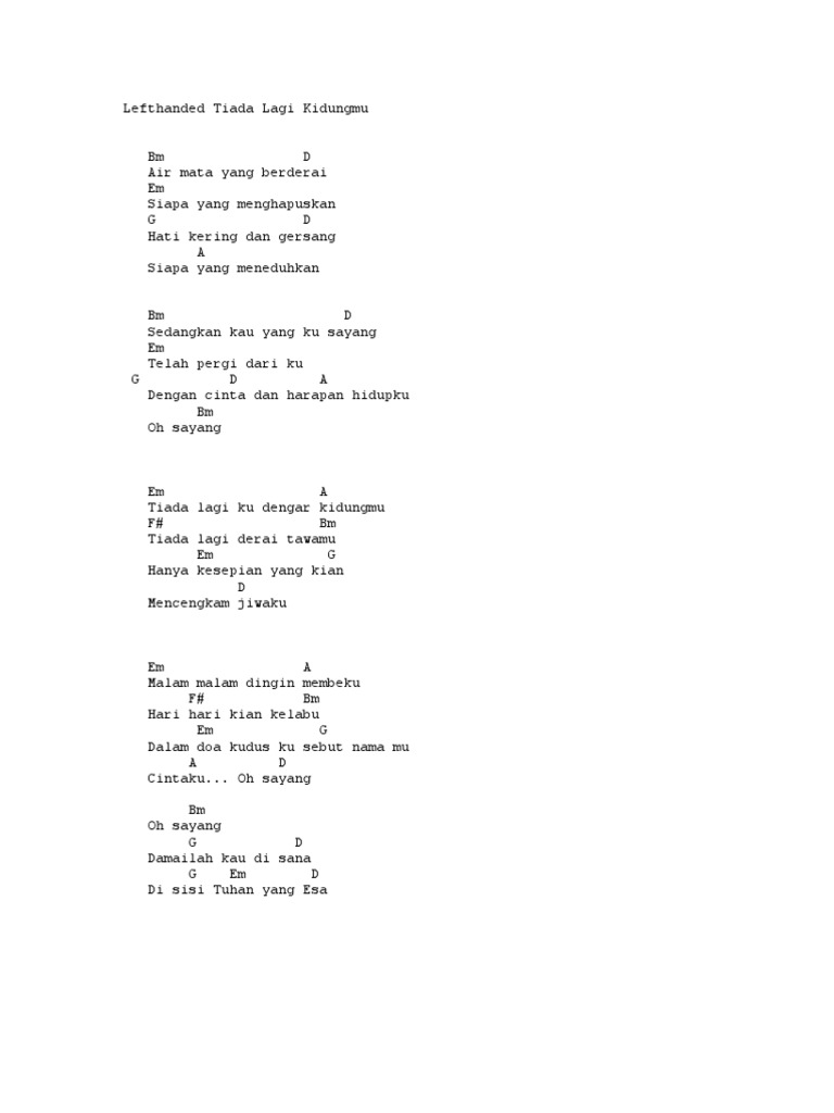 Lirik tiada guna lagi dari republik ini dipublikasikan pada tanggal 26 juni 2009 (12 tahun yang lalu). F bila itu yang harus terjadi g dengan besar hati. Klik di sini untuk melihat chord dari lagu ini. F mengharapmu untuk kumiliki g takkan ada lagi. Lagu ini diciptakan oleh kohar kohler dan ada di dalam album spesial album kenangan yang didistribusikan oleh label aini record. Lagu dangdut populer lagu tiad. Seluruh media termasuk lirik lagu ataupun chord lagu yang terdapat disini hanyalah untuk media promosi dan pembelajaran. ★ mp3ssx on mp3 ssx we do not stay all the mp3 files as they are in different websites from which we collect links in mp3 format, so that we do not violate any. Bila ini terjadi pada diri sendiri. Tiada lagi senyuman manis bisik lirih tiada lagi tawa riang belai sayang lenyap sudah…musnah sudah harapan… hancur sudah cinta suci di gelombang. Sampai kapan lagi aku harus menahan rasa kecewa di dalam dada. Oh sayang damailah kau di sana di sisi tuhan yang esa. 'tiada lagi' merupakan salah satu singel hit milik penyanyi mayangsari yang rilis pada 1998.