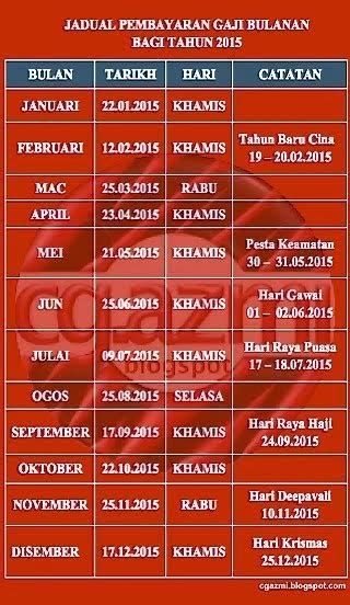Muat turun borang (perhimpunan bulanan). Jadual pembayaran gaji kakitangan awam tahun 2020. Tarikh pembayaran gaji penjawat awam tahun 2017. Menjelang januari 2017 ini gaji penjawat awam dibayar lebih awal iaitu pada 19 hb kerana sambutan perayaan tahun baru cina. Jik anda perhatikan, perbezaan jadual gaji 2017 tidak begitu ketara.